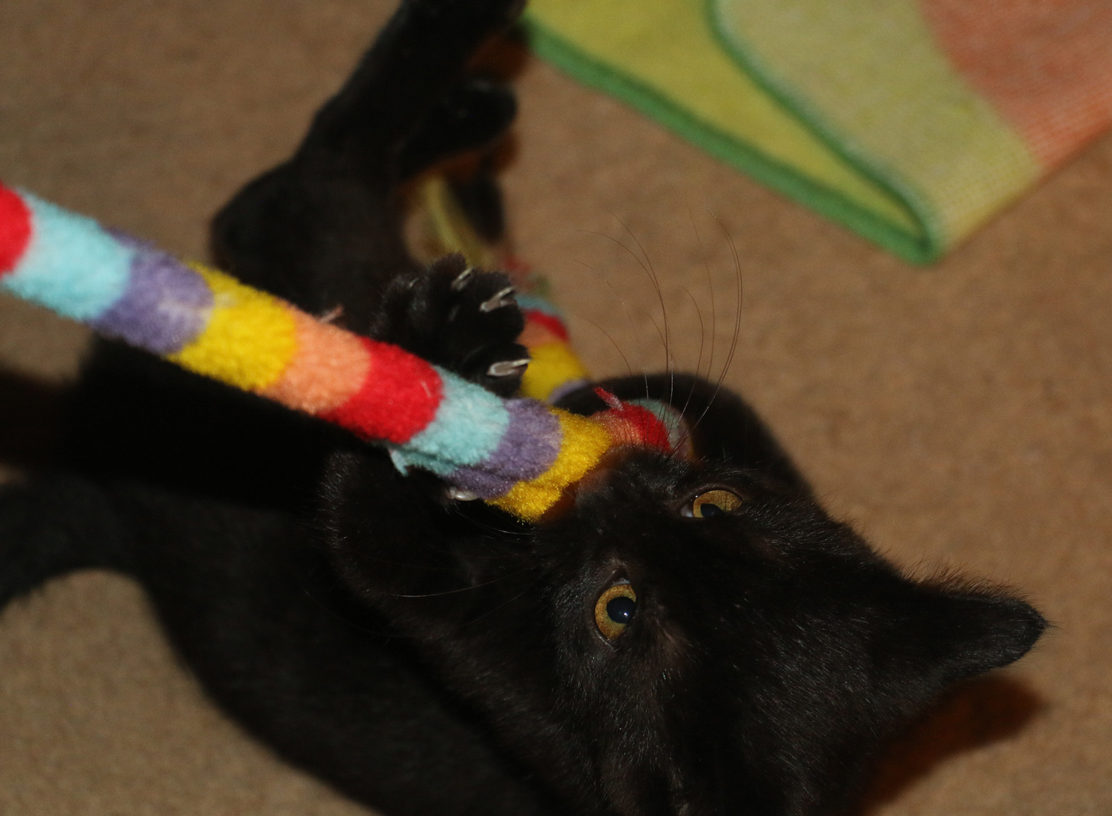 While the other three cats were elsewhere, we let Londo out to play. His eyes were beginning to heal, though they looked terrible right after receiving medication.