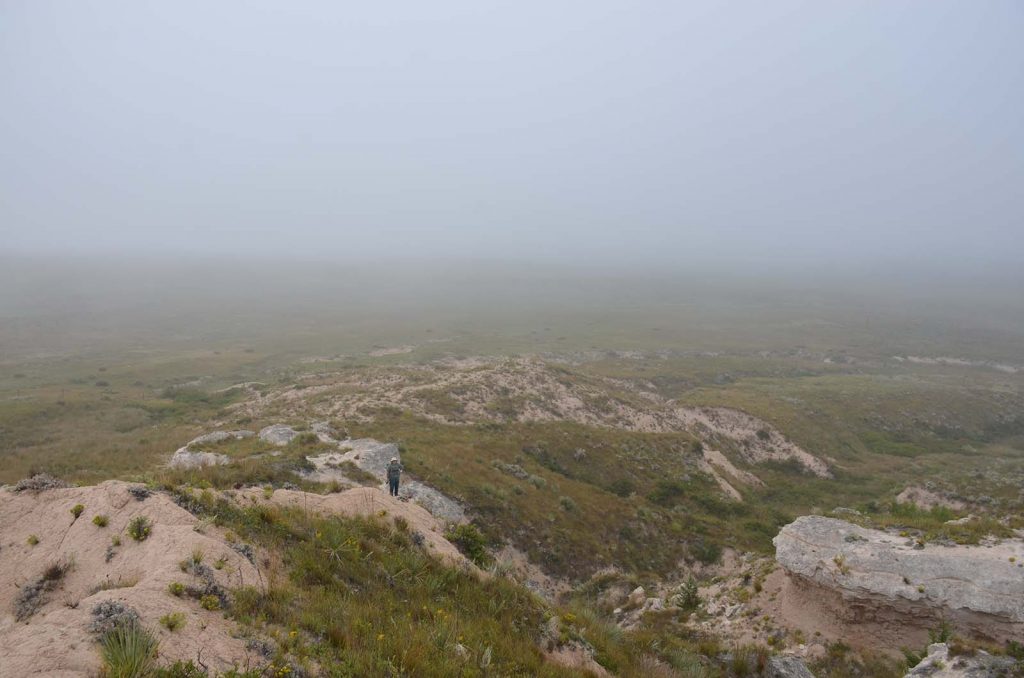 The fog completely covered the area. Chimney Rock is in this picture. The grass is also unusually high for this time of year. The dew drenched Sandra and I. By the time we reached Chimney Rock, our pants and t-shirts were soaked.