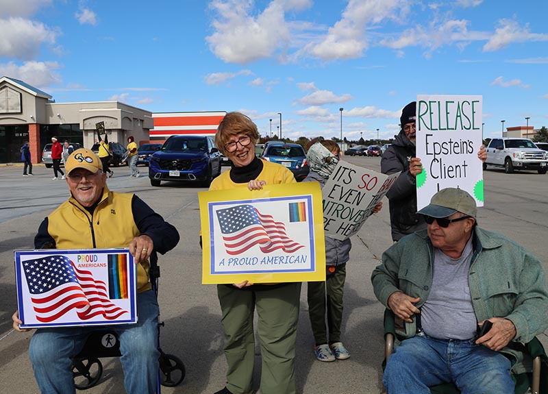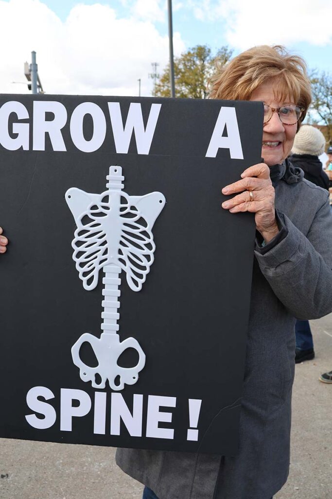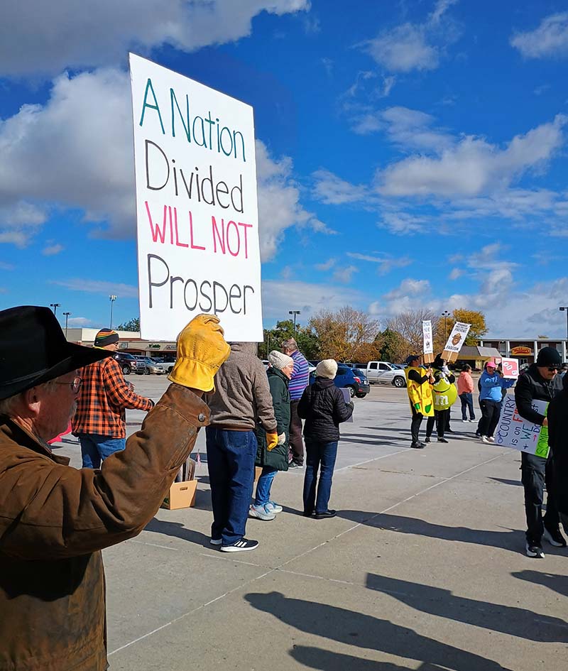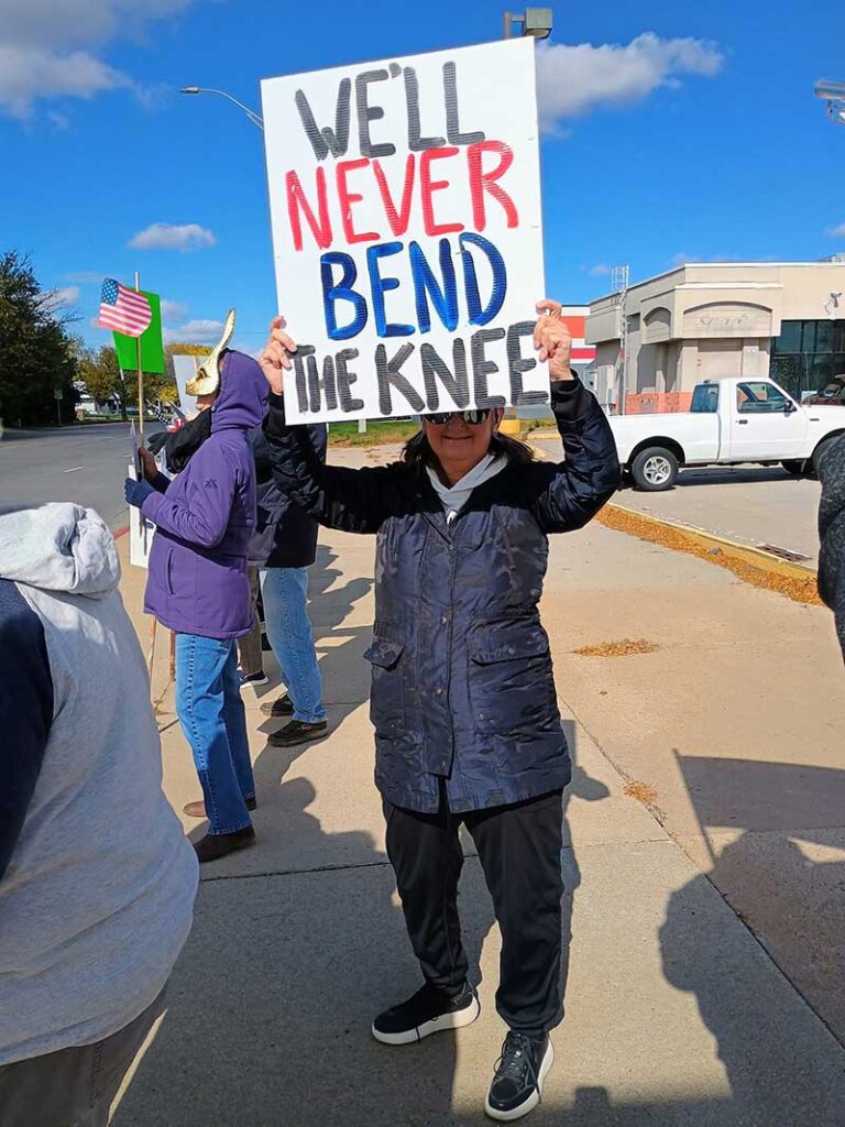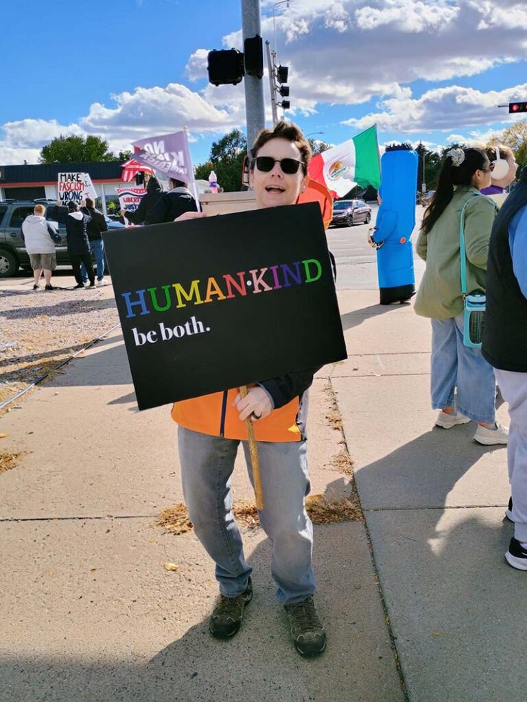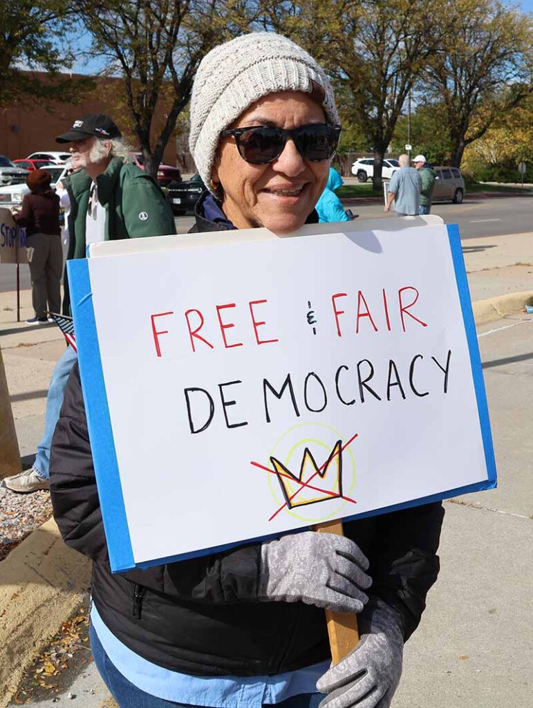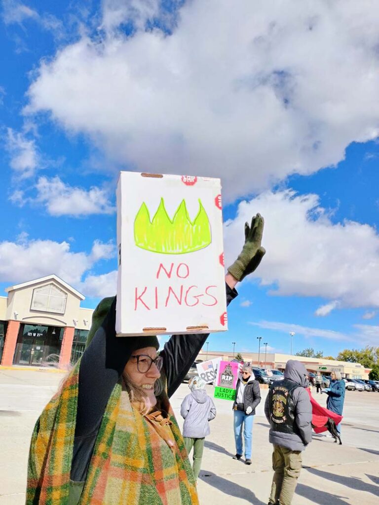 Donna proudly hoists her sign at the No Kings protest in Scottsbluff.