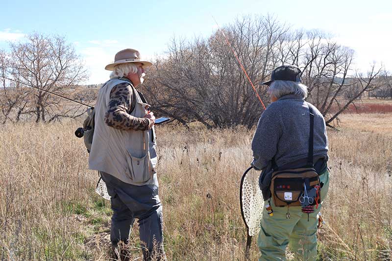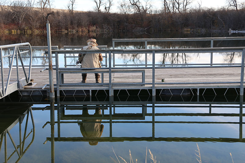 Steve sits at Cherry Creek Pond at Fort Robinson State Park and takes a moment to change the fly on his flyfishing pole before he gets back to catching fish.