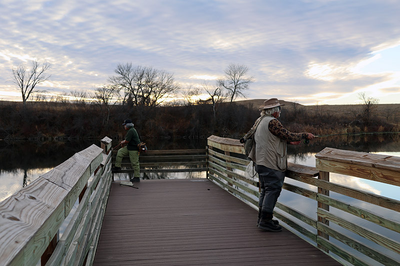 Sandra and Steve cast one more line each as the sun sets on their day of fishing on the dock at the Cherry Creek Ponds. This dock was moved from the Carter P. Johnson lake after officials at Fort Robinson closed the lake.