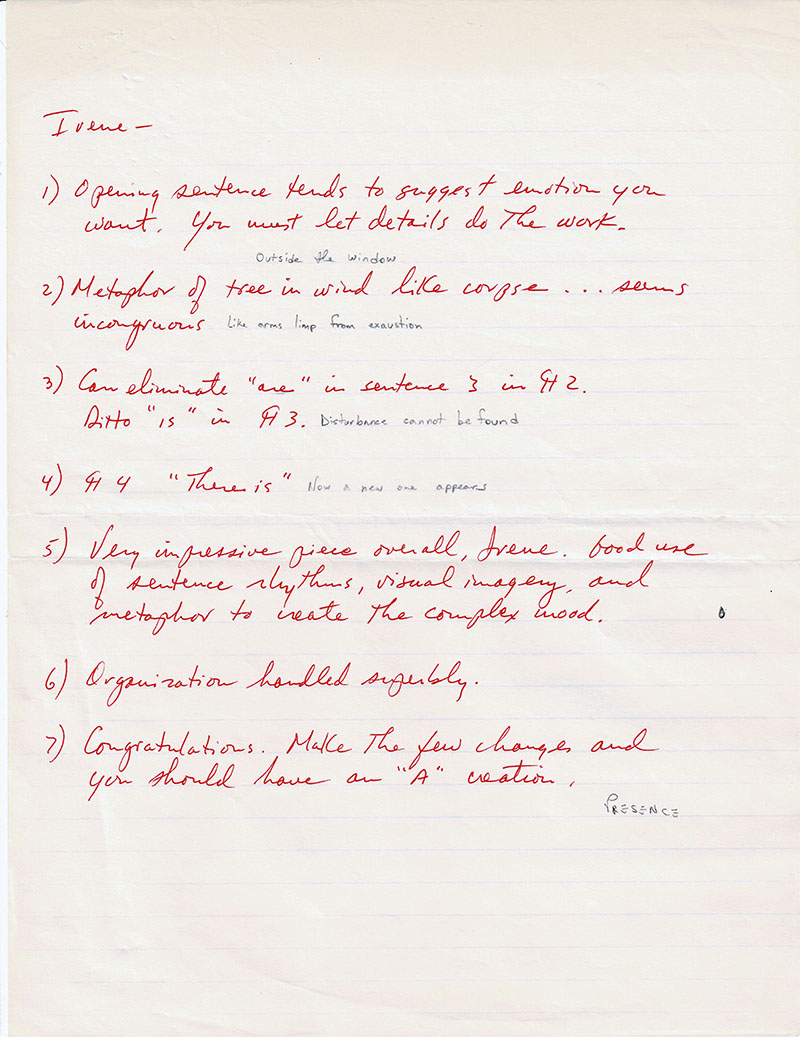 Ms. Prather’s comments on the draft I turned in for class in 1988. I did receive that “A” for the assignment.